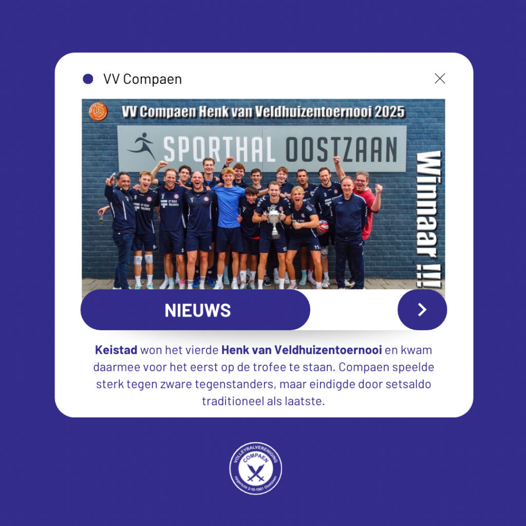 Keistad is winnaar geworden van het vierde Henk van Veldhuizentoernooi van Compaen. De naam van de Amersfoorters komen daarmee voor de eerste keer op de trofee te staan. Eerder zegevierden Dynamo 2 en tweemaal Sneek. Laatstgenoemde ploeg kon door de terugtrekking uit het landelijk volleybal de titel niet verdedigen. De organisatie van het toernooi wist dat er maar een team kon zijn dat het evenement extra allure kon geven en dat was de kampioen van de superdivisie: Peelpush...