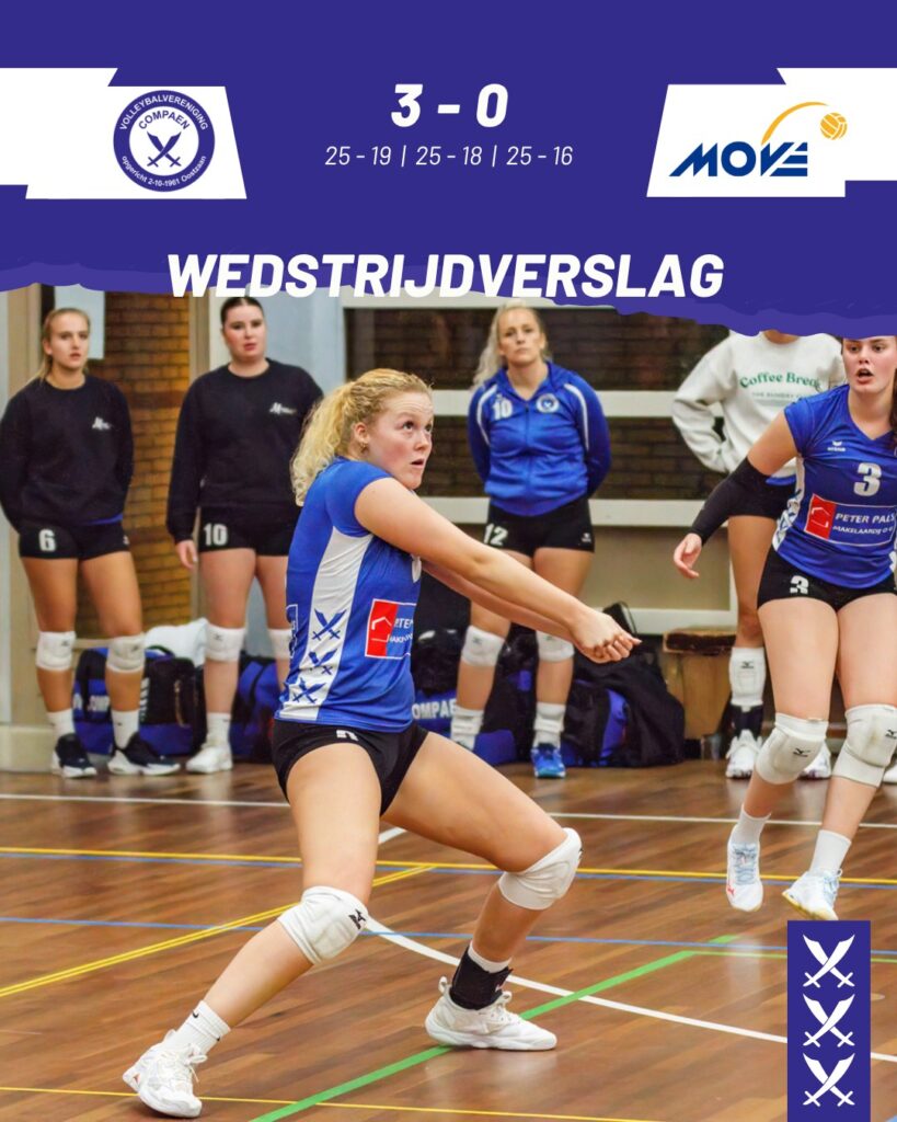 Dinsdagavond 21 oktober 2025 stond de bekerwedstrijd van Dames 1 Compaen op het programma. Tegenstander: Move Dames 2. De eerste set begon wat onrustig. De pass liep niet altijd lekker, de communicatie kon beter en er vlogen wat ballen nét buiten de lijnen. ‘Time- out” aangevraagd door de Bob de Coach en een peptalk en we konden er weer tegen aan. Gelukkig kwamen de services toen op gang met een mooie series en het spel wat weer op gang kwam hebben we de set binnen gesleept.