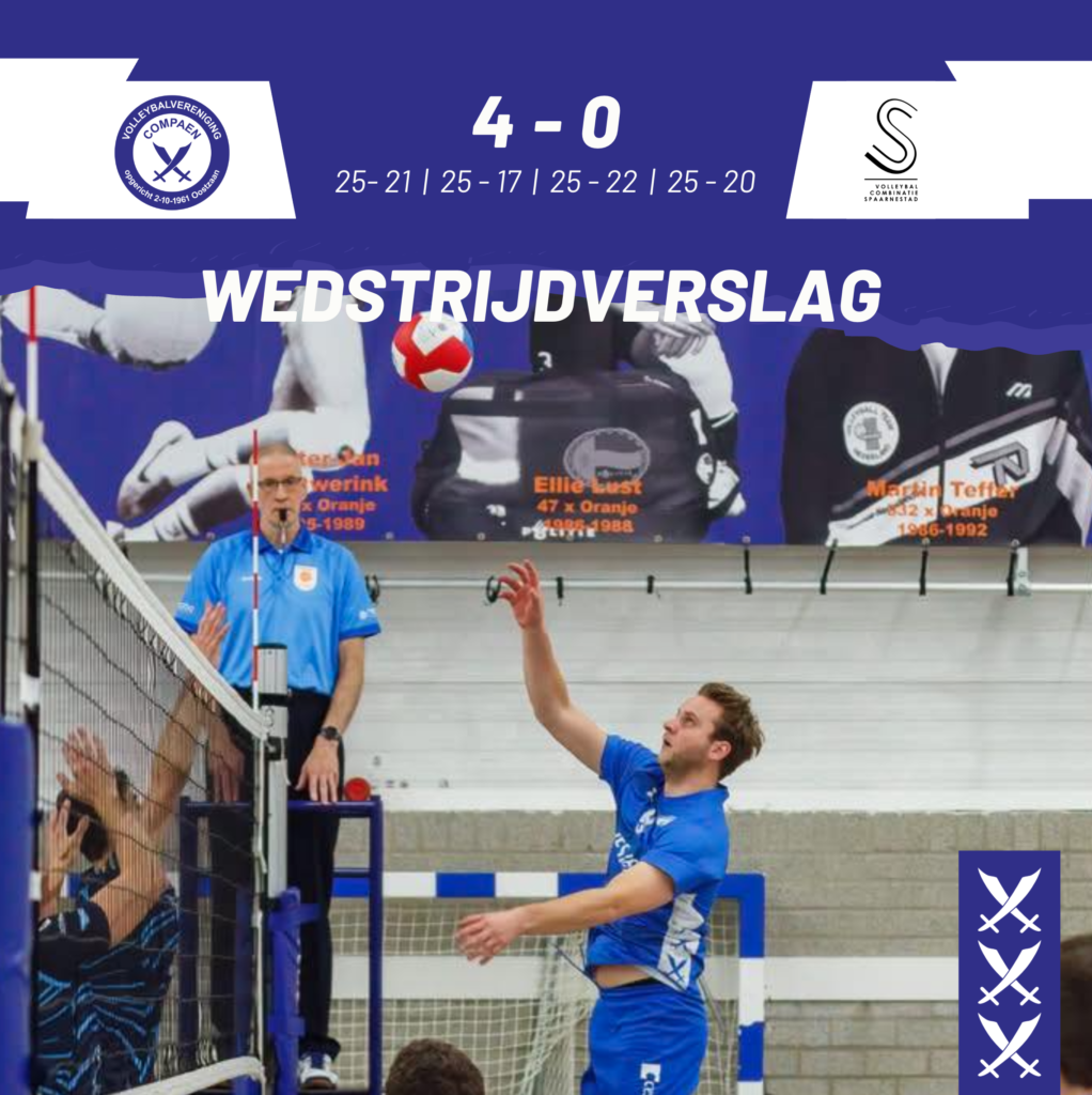 Met bulten, littekens en schrammen op de zeerovershuid van de eerdere ontmoetingen heeft Compaen Heren 1 eindelijk eens kunnen afrekenen met de volleyballende Muggen van Spaarnestad. Een klinkende zege met 4-0 maakte een einde aan een reeks die traumatische vormen begon aan te nemen. Bijna altijd begonnen de Oostzaners als favoriet aan de Noord-Hollandse derby, maar de laatste zes duels gingen wel gewoon naar de Haarlemmers. Compaen maakte bij Spaarnestad het beste los. Als de buren van 27 kilometer verderop er telkens met de buit vandoor gaan, mag gesproken worden van een Angstgegner. Dat resultaten behaald in het verleden geen garantie voor de toekomst bieden, bleek zaterdag in Sporthal Oostzaan. Hoewel Spaarnestad duidelijk in een mindere fase zit – vorige week in een thuiswedstrijd verlies tegen degradatiekandidaat Volley Tilburg – mocht dat gezien het verleden met uitglijders voor Compaen geen indicatie voor dit treffen zijn...
