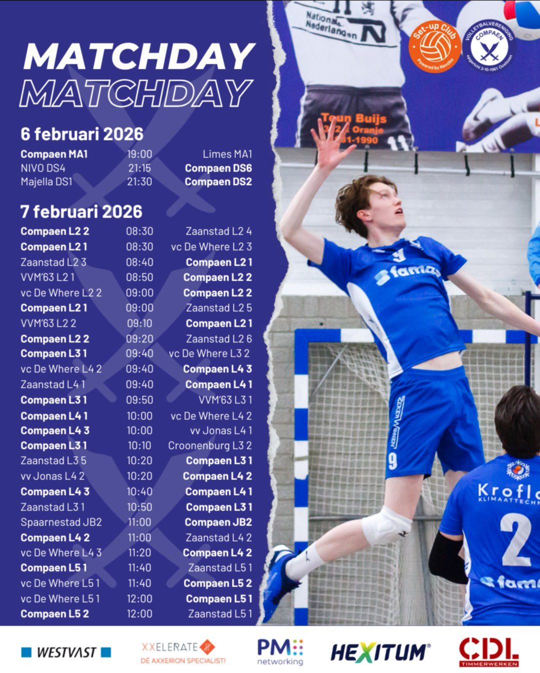De herenlijn van volleybalvereniging Compaen heeft de wind momenteel stevig in de zeilen. Het eerste team staat tweede in de Topdivisie en het tweede en derde zijn nu koplopers in respectievelijk de Eerste divisie en Promotieklasse. Die laatste twee ontsnapten vorig seizoen nota bene nog aan degradatie in de beslissingswedstrijden. Compaen kijkt niet alleen naar het heden, maar zeker ook naar de toekomst. Daarin past het in de seniorencompetitie meedraaien van een jeugdploeg en de opzet om van Heren 2 nadrukkelijk een opleidingsteam te maken. Jonge spelers kunnen op een voor westelijk Nederland uniek niveau van Eerste divisie vlieguren maken en ontwikkeld worden tot volleyballers voor Topdivisie en hoger...