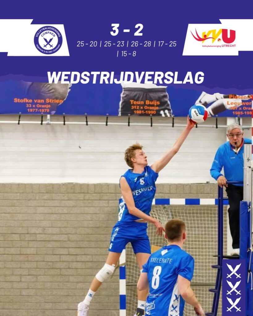 Voor Compaen Heren 1 volstond in de wedstrijd tegen Utrecht het winnen van een set om de tweede plaats in de topdivisie veilig te stellen. De Oostzaners sleepten zich moeizaam naar het einde van de competitie, maar richtten zich in de belangrijkste wedstrijd van het seizoen op. Ze stonden er toen het nodig was. Het aanvalspercentage was zelden zo hoog, het foutenpercentage bijna nooit zo laag. Clubman Milan Muijs nam zijn team in de openingsset op sleeptouw. Met zes punten uit tien set-ups toonde hij zich doordrongen van het belang om gelijk het initiatief in de wedstrijd te nemen, zodat spanning van het moeten nooit een rol zou gaan spelen. Nikita Artamonov vond zijn spijkerharde sprongservice terug en scoorde zo twee aces en Jary Kroon produceerde twee killblocks...